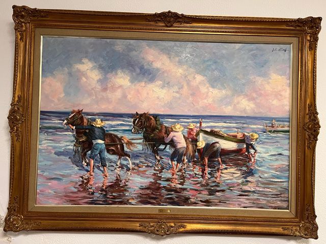 Detalles del productoPrecioso lienzo del pintor José Lull, con unas dimensiones de 120x80 cm. La obra representa una escena marinera con caballos y pescadores.