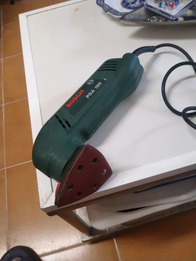 Lijadora eléctrica triangular de la marca Bosch. - Modelo PDA 180. - Diseño ergonómico para un agarre cómodo. - Base triangular para acceder a esquinas y bordes.