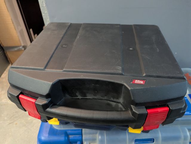- Estuche de plástico negro con cierres rojos y amarillos.