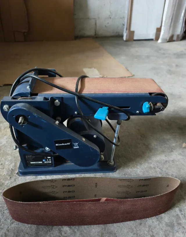 Lijadora de banda Einhell BT-US 400. - Color azul. - Incluye 2 bandas y banda de lijado P80 nueva.