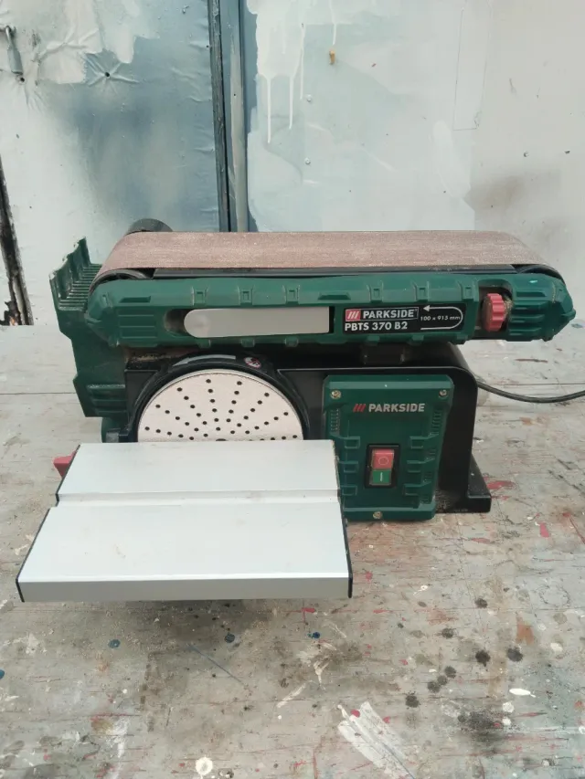 Lijadora de banda y disco de la marca Parkside. - Modelo: PBTS 370 B2. - Color: Verde y negro. - Incluye mesa de trabajo.