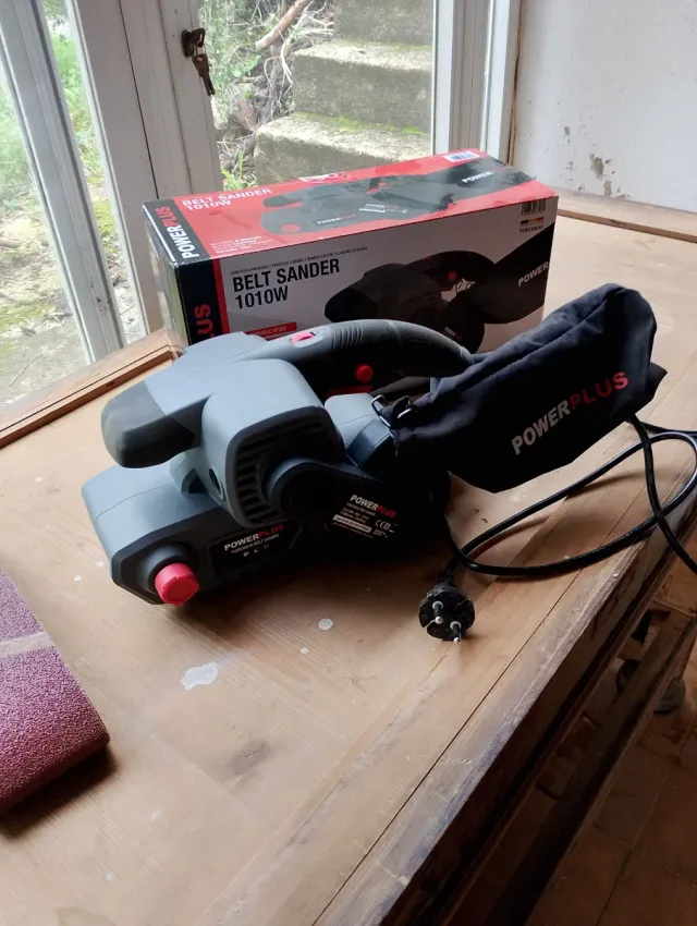 Lijadora de banda Powerplus de 1010W, utilizada una sola vez. - Potencia: 1010W - Incluye bolsa para el polvo.