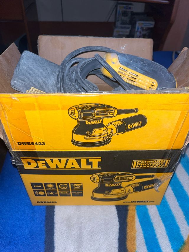 Lijadora orbital de la marca DeWalt, modelo DWE6423. Es una herramienta eléctrica con cable. - Potencia de 280W. - Diámetro de órbita de 2.6mm. - Velocidad de 12000 opm.