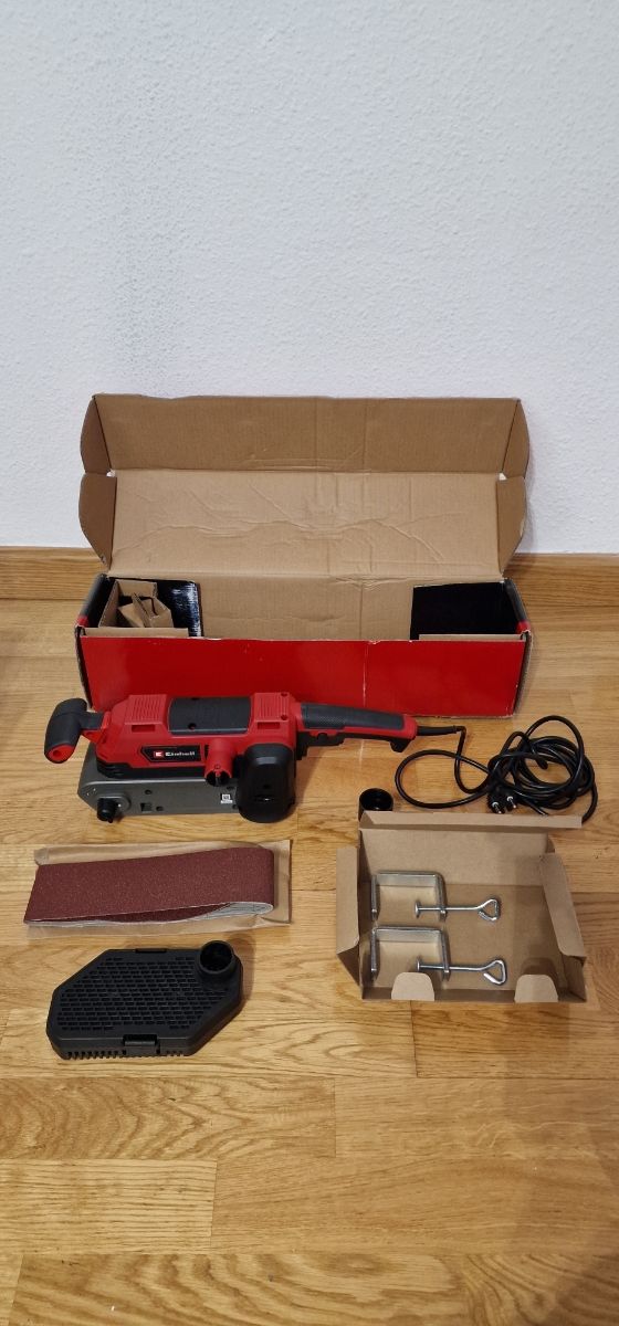 Einhell Lijadora de banda TE-BS 850 E (850 W, velocidad de la cinta abrasiva de 400 m/min, ajuste fino de la marcha de la banda, aspiración de polvo. Usada 1 vez.