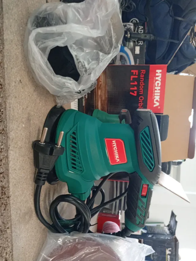 Lijadora eléctrica orbital aleatoria HYCHIKA. - Modelo FL117. - Color verde y negro. - Incluye cable de alimentación con enchufe.