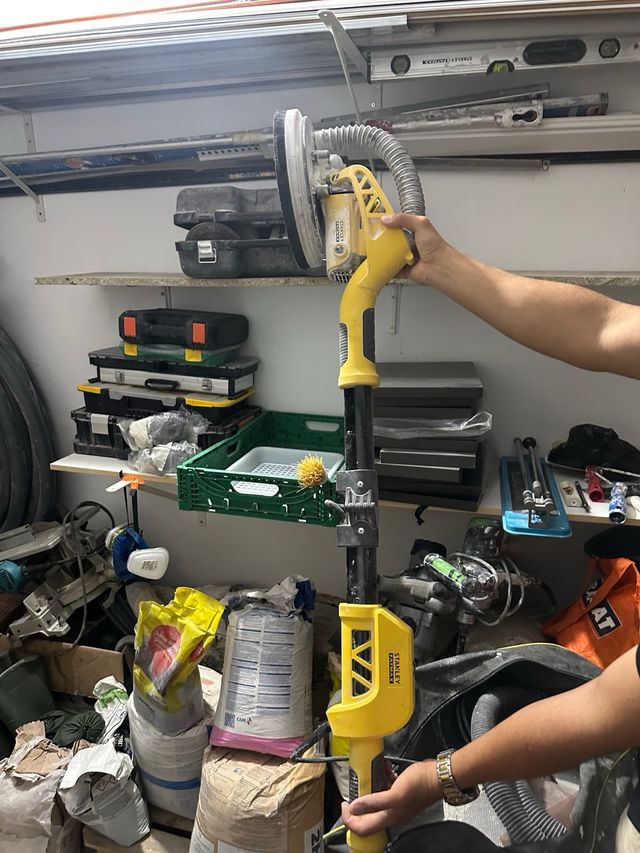 Lijadora de jirafa marca Stanley, ideal para trabajos en paredes y techos. - Mango extensible. - Cabezal pivotante. - Conexión para aspiración de polvo.