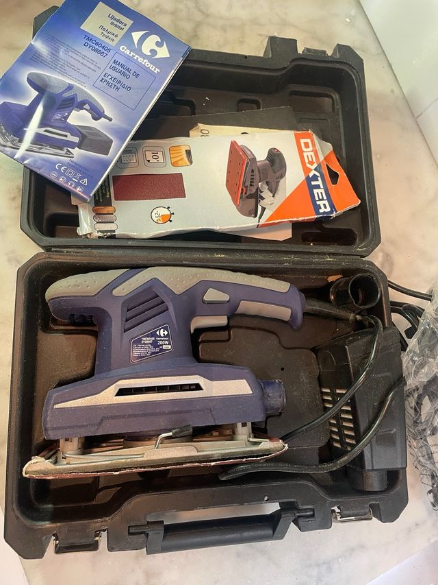 Lijadora orbital Carrefour modelo TMC60405. - Incluye manual de usuario. - Incluye caja de transporte. - Incluye algunas hojas. - Potencia de 200W.