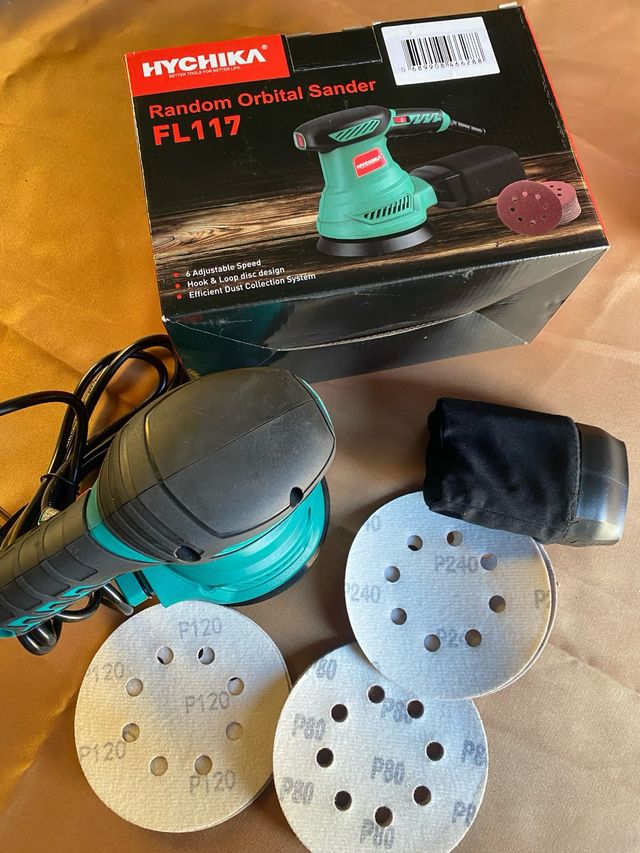 Detalles del productoLijadora orbital HYCHIKA FL117 en color verde y negro. Incluye varios discos de lijado y bolsa para el polvo.