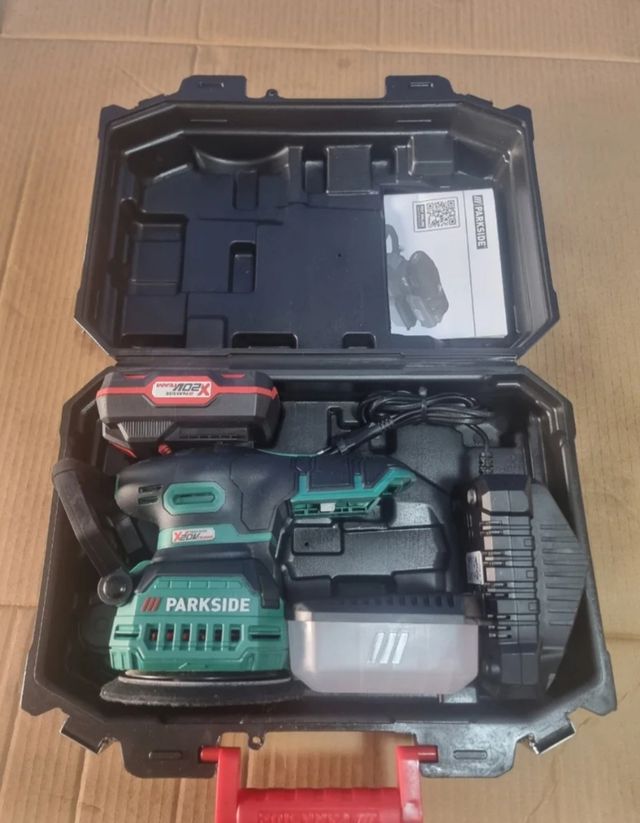Lijadora a batería de la marca PARKSIDE modelo PAEXS 20-Li A1. Lijadora excéntrica con maletín, batería y cargador.