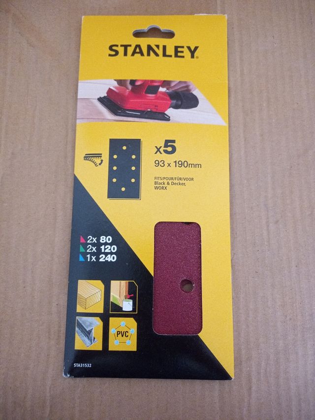 Detalles del productoPack de 5 lijas Stanley para lijadora, con medidas de 93x190mm. Compatibles con Black & Decker y Worx.
