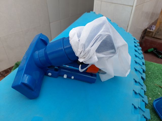 limpiador de fondo de piscina manual. Se le engancha la manguera y succiona la suciedad.
