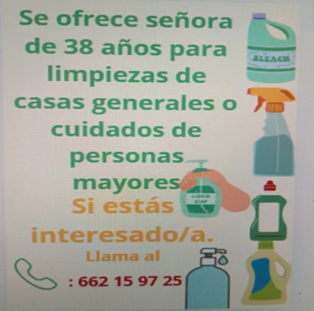 Chica de 38 años ofrece su servicio para limpieza de hogar en general y cuidado de persona mayores 9€ la hora
