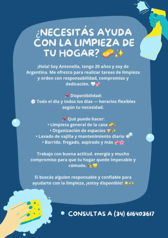 Tengo 20 años y soy de Argentina. Me ofrezco para limpieza y mantenimiento del hogar con responsabilidad y dedicación.
