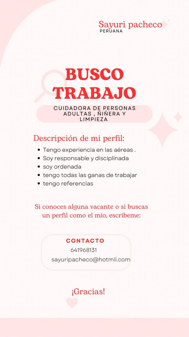 • Tengo experiencia en las aéreas. • Soy responsable y disciplinada • soy ordenada • tengo todas las ganas de trabajar • tengo referencias
