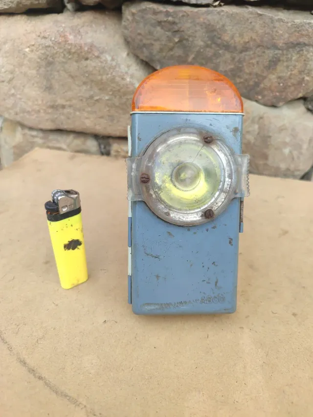 Linterna antigua de color azul con detalles en naranja y transparente. Presenta un diseño robusto y clásico. - Cuerpo metálico. - Lente protectora. - Bombilla visible.