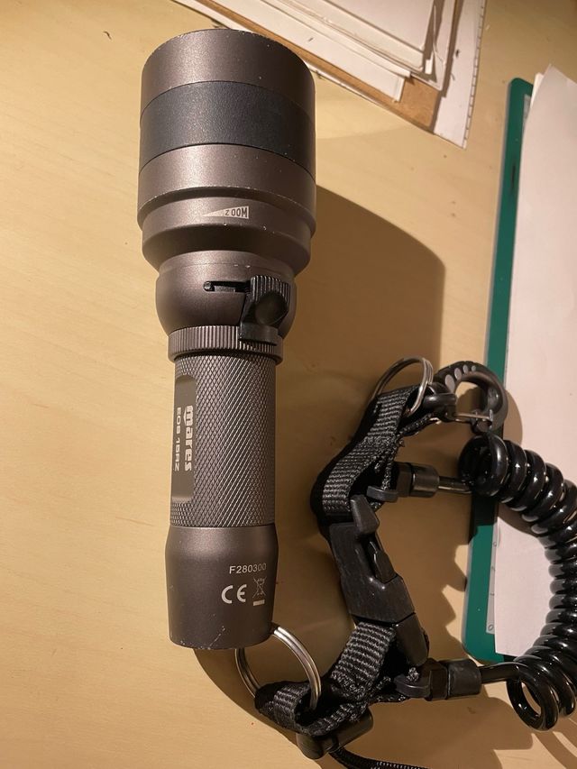 Linterna de buceo Mares EOS 15RZ con correa. - Zoom ajustable. - Correa de seguridad en espiral. - Marcado CE.