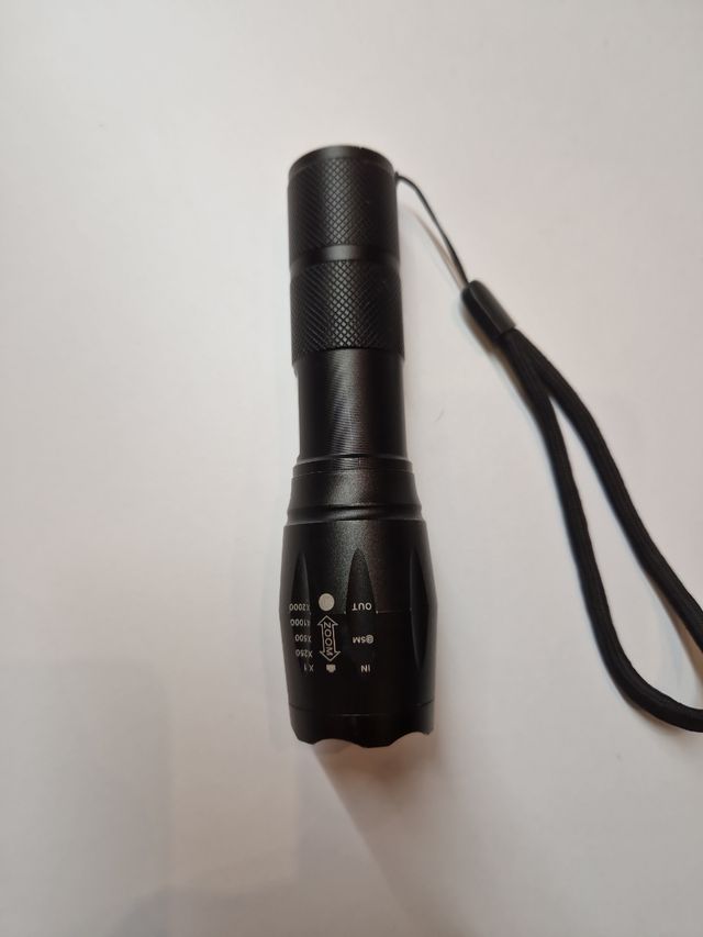 Detalles del producto linterna de bolsillo Led flinltronic XML-T6. cuerpo metálico muy resistente. tiene zoom y varias posiciones que se pueden poner con el pulsador trasero. utiliza tres pilas AAA. Medidas del producto