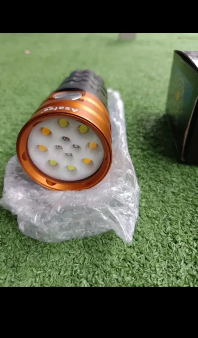 Linterna de buceo Asafee con diseño robusto y acabado naranja. - Múltiples LEDs para una iluminación potente. - Cuerpo de aluminio resistente.