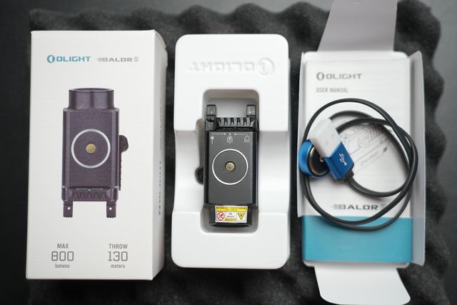 Detalles del productoLinterna Olight BALDR S con láser integrado. Incluye manual de usuario, cable de carga y demas accesorios para su montaje.