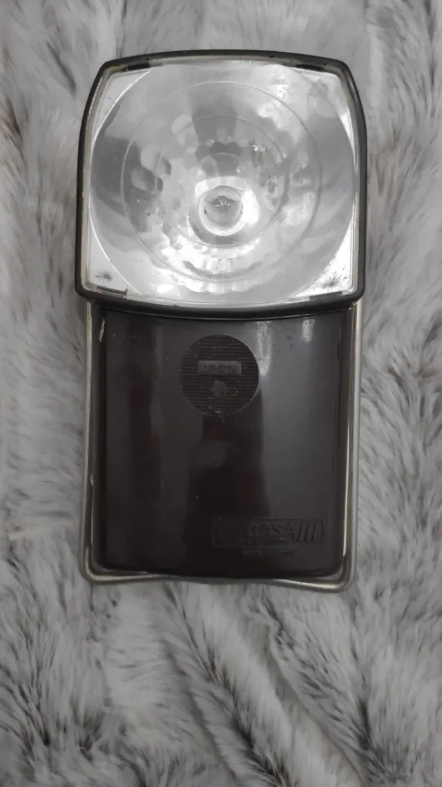 Linterna antigua de la marca GASAI. Un objeto de colección con un diseño clásico. - Cuerpo principal de plástico oscuro. - Reflector metálico. - Marco protector de metal.