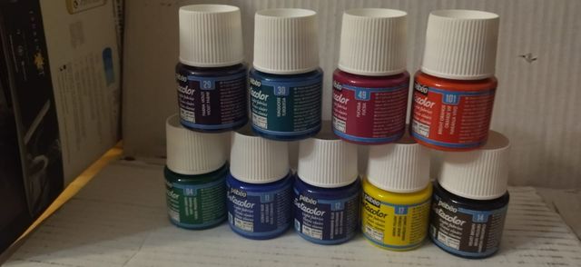 Detalles del productoLiquidación:Lote de 9 botes de pintura para tela, ( transparente) de PEBEO colores, núm 4 verde pradera - núm 11 azul cobalto - núm 12 azul ultramar - núm 17 amarillo limón - 14 marrón terciopelo - núm 29 violeta parma - 30 turquesa - 49 fucsia núm 101 naranja vivo