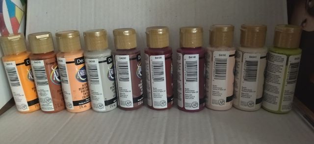 Detalles del productoLote de 10 colores AMERICANA, bote de 59 ml, Da12 mandarina, Da 016 naranja tostado, Da 023duraznos con crema, Da 069 gris paloma, Da 097 rojo rookwood, Da 128 borgoña profundo, Da 140 rojo violeta, Da 192 rosa chiffon,Da 241 moka claro, Da 235 verde limón.