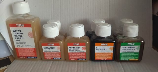 Detalles del productoSe vende lote de productos Titán, 1 bote de barniz mate de 250 ml+ 2 botes barniz mate de 100 ml+1 bote de barniz satinado de 100 ml+2 botes secativo de cobalto de 100 ml+2 botes goma arábiga de 100 ml