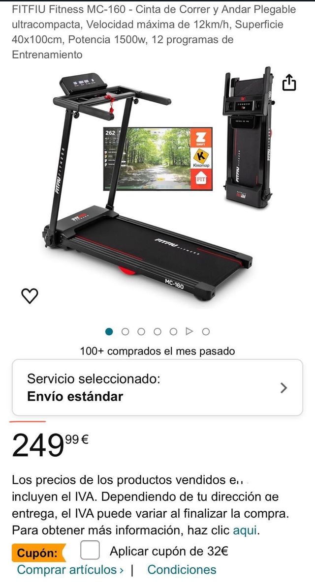 Detalles del productoSolo esta semana…Liquidación solo este mes a estrenar………. 1 unidad FITFIU nueva a estrenar..Fitness MC-160 - Cinta de Correr y Andar Plegable ultracompacta, Velocidad máxima de 12km/h, Superficie 40x100cm, Potencia 1200w, 12 programas de Entrenamiento. Además, dispone de un sistema de amortiguación VCS (Variable Cushioning System) …precio no negociable….tengo varias unidades …oferta única hasta agotar stock…Dimensiones en uso