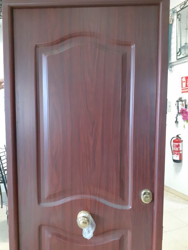 Detalles del productoPuerta Nueva de Exposición. Nueva . De liquidación. Color imitación madera. De medidas 2.10altox90cm Cerradura de seguridad de 3puntos , bombillo de seguridad con escudo. Herrajes de latón. No hacemos envíos Medidas del producto
