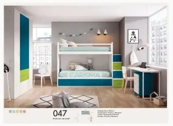 Detalles del productoLitera con dos bases de 90x190, dos contenedores y un baúl. Medidas: 165 alto x 102 fondo x 202 ancho. No necesita somier. Tenemos una gran variedad de acabados y colores a elegir. *Disponemos de literas de 90x200. Si lo queprefiere es la composición completa, esta incluye: litera, armario de 240x180 con cuatro puertas, cuatro cajones y un contenedor, escritorio, mesita de tres cajones con ruedas, escalera de contenedores y quita-miedos metálico para litera. Precio 2320€. Financiamos hasta 12 meses sin intereses. Transporte y montaje opc cama 95 y de la composición 130€. Garantía de 2 años. Consultas por whatsapp 672699523