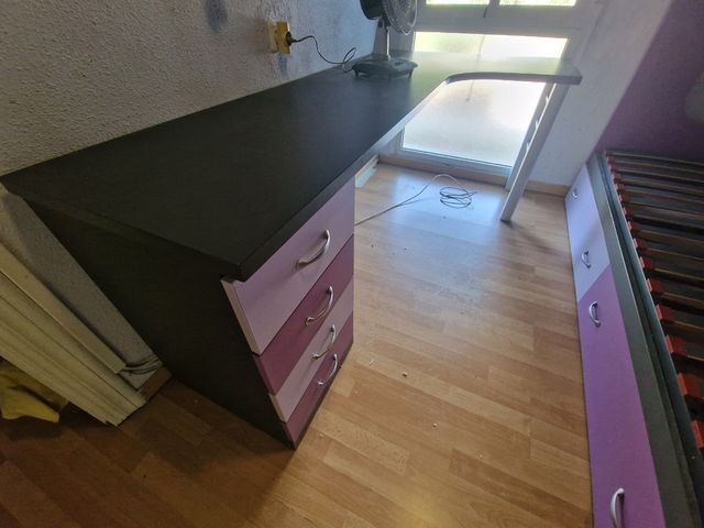 Detalles del productoMueble infantil de dos piezas: litera y escritorio. El escritorio tiene un diseño en esquina y varios cajones para guardar cosas. El conjunto está en buen estado y es ideal para una habitación infantil o juvenil.