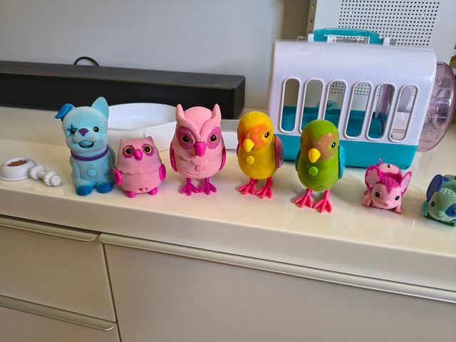 Cantan, repiten lo que dices, interactúan entre ellas, las ratitas corren.. incluyo transportín. Todos por 15 euros. No incluyo pilas pero todos funcionan perfectamente. Son de la colección de mascotas little live pets