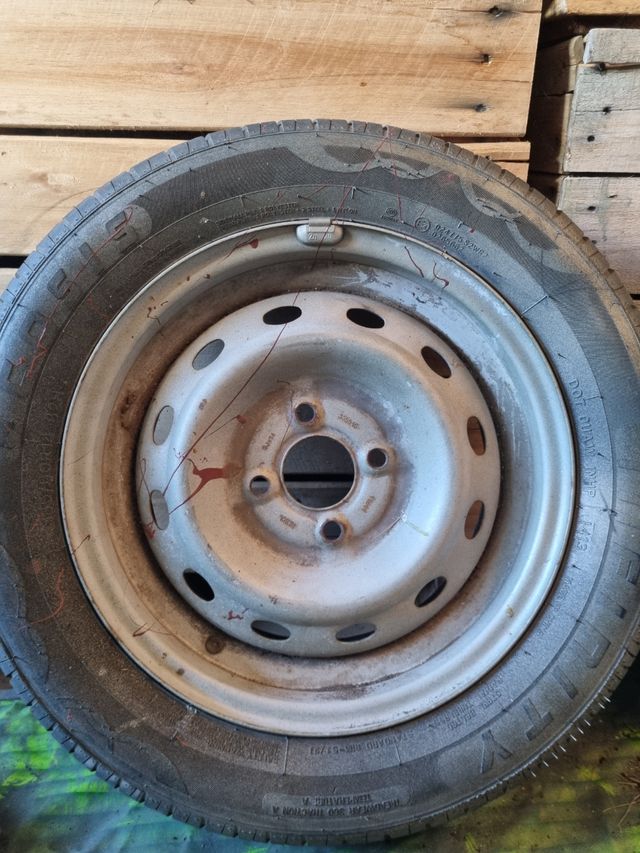 Llanta usada de 14" 4x100 en chapa acero. Tiene montado un neumático usado 185/60/R14 82H (SIN COSTE AÑADIDO)