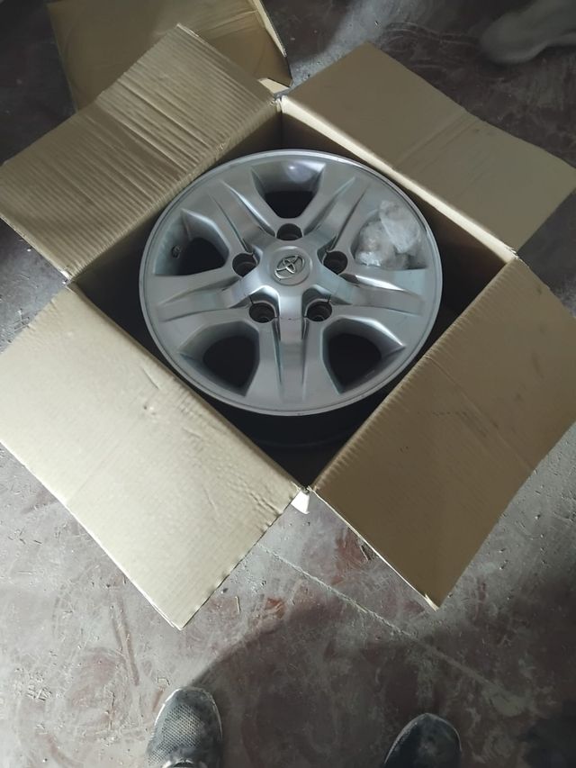 Llanta de aleación plateada con logo de Toyota. - Diseño de 5 radios. - Se vende en caja de cartón.