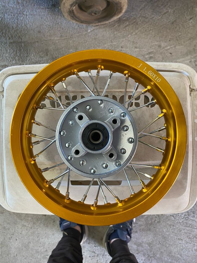 Detalles del productoPllanta trasera para pit bike nueva sin usar, color dorado, es de 10 pulgadas, medidas en las fotos del eje y distancia del basculante, mas informacion preguntar sin compromiso.