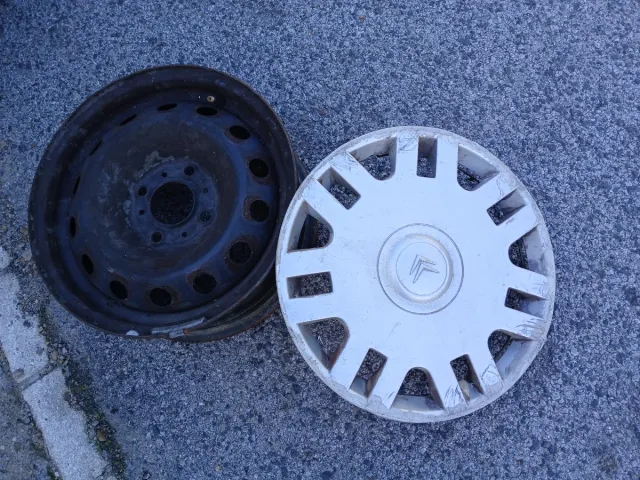 Se vende llanta de acero y tapacubos para Citroën C3. El tapacubos tiene el logo de Citroën. - Llanta de acero. - Tapacubos de plástico plateado.