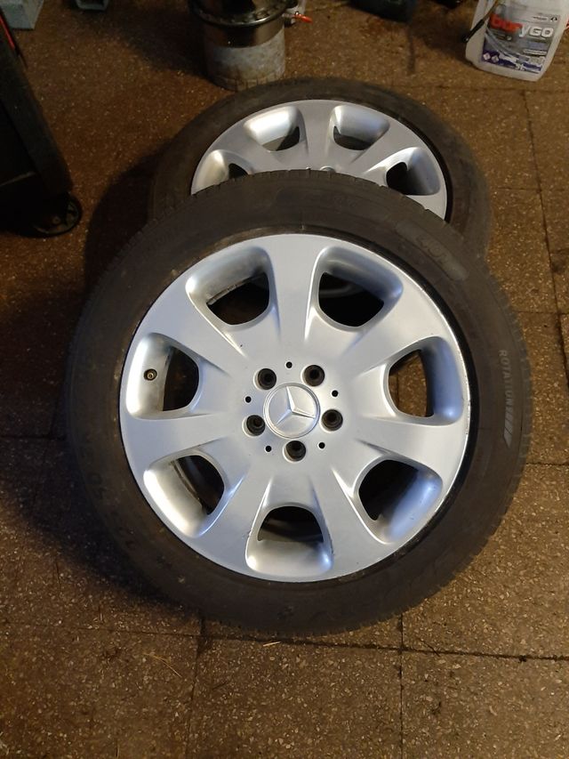 Detalles del productose venden 2 llantas de Mercedes de 17 pulgadas con sus neumáticos con poco uso 225 50 17. cada llanta 60 euros y las dos 100 euros. el envío a cargo del comprador Medidas del producto