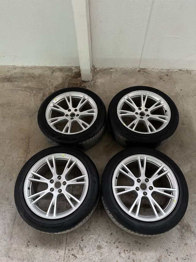 Detalles del productoJuego de 4 llantas Gemini de 19 pulgadas para Tesla Model Y, con gomas a medio uso Ventus s1 evo3 255/45R19 (una de las gomas lleva dos “mordiscos” que se ven en las fotos) y tapacubos originales.