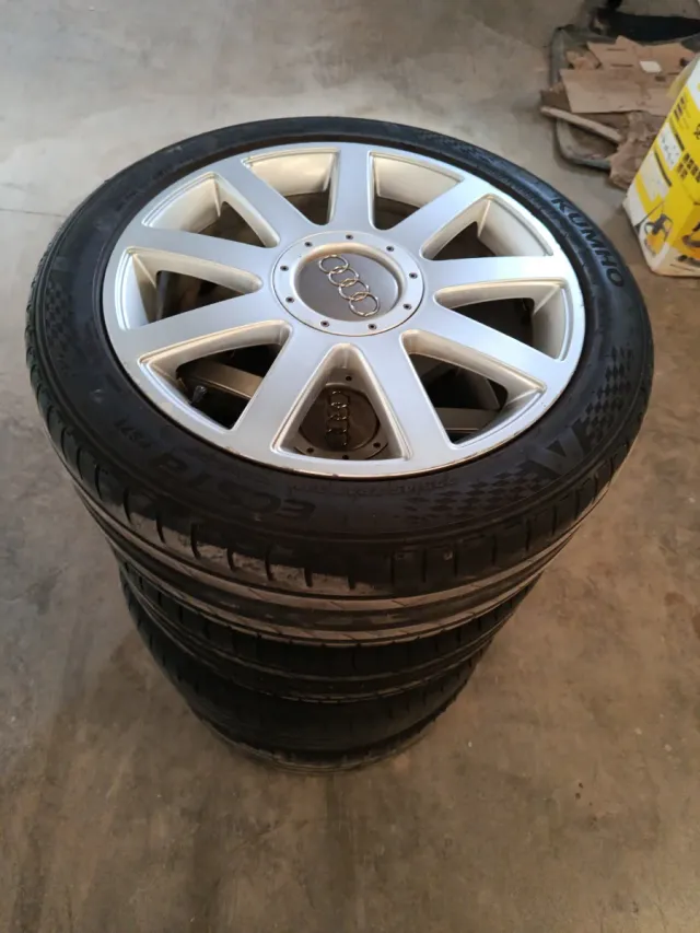 Detalles del productoEn venta juego de 4 llantas para Audi a3 8p modelo s-line originales anclaje 5x112 et 56 17 pulgadas en buen estado sin golpes ni llantazos,algún leve roce nada importante en las fotos se pueden apreciar muy bien, buen estado, neumáticos 225/45/17 aprovechables a un 50% de vida útil vendo todo el conjunto llantas y neumáticos por 350 euros envío a cualquier punto de España previo pago por transferencia o bizum gastos de envío a cargo del comprador abstenerse ofertas inferiores no contestare precio fijo