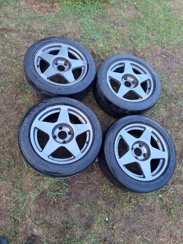 Detalles del productoSe venden cuatro llantas Compomotive mo5 en buen estado. Una de ellas esta rascada en el borde, son las de 7 de ancho 4x108 et25 y cuatro semi eslick nankang dos a medio uso y dos más gastados.
