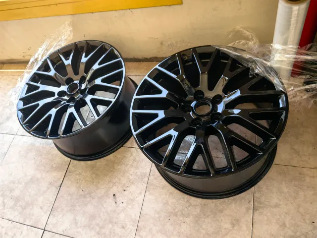 Detalles del productoJuego de llantas para Ford Mustang Performance. Son llantas de aleación negras con un diseño deportivo.