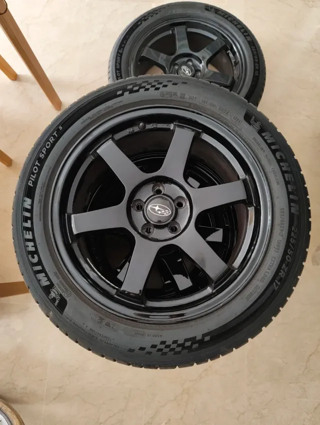Montadas en un Subaru Forester, vendo porque ya cambié a 18". Una de las llantas tiene un par de marcas pequeñas del uso que se pueden apreciar en las fotos. Los neumáticos están prácticamente nuevos, tienen alguna marca de roce muy superficial que al ir cargado el coche en alguna ocasión rozaba la aleta, se ve en las fotos en detalle.