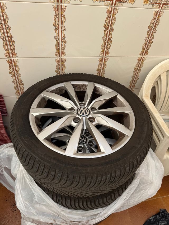 Juego de llantas de aleación de 17 pulgadas para Volkswagen + Cubiertas - Diseño deportivo de 5 radios dobles. - Acabado plateado. - Incluye tapas centrales con logo.