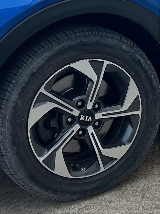 Juego de llantas de aleación para Kia. - Diseño deportivo de 5 radios. - Acabado bicolor (negro y plata). - Logo de Kia en el centro.