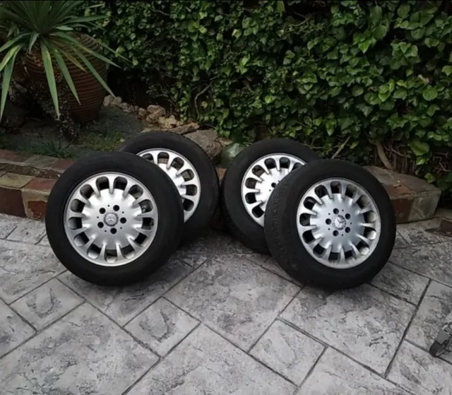 Juego de 4 llantas originales de aleación para Mercedes e320 e220 e200 e270 e280 - Diseño multirradio plateado. - Logo de Mercedes-Benz en el centro. - Neumaticos al 80%