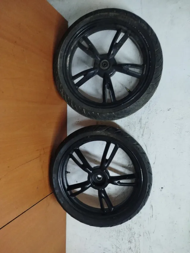 Juego de llantas para Peugeot Tweet. Delantera 110/70-16 M/C 52S Trasera 110/70-16 M/C 52S - Color negro. - Diseño de 5 radios.
