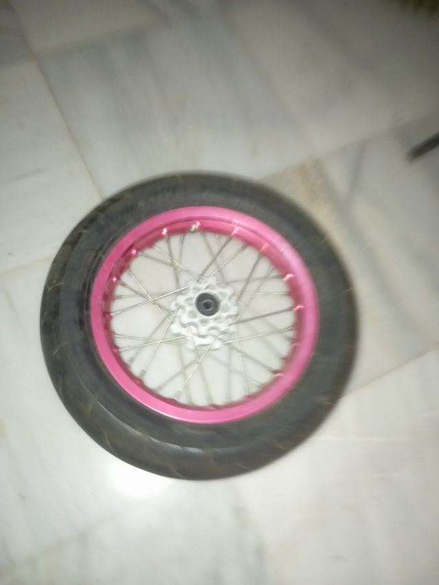 Detalles del productoVendo llanta para pit bike de 12 pulgadas. Es de color rosa y tiene un neumático en buen estado. Solo necesita corona y disco delantero