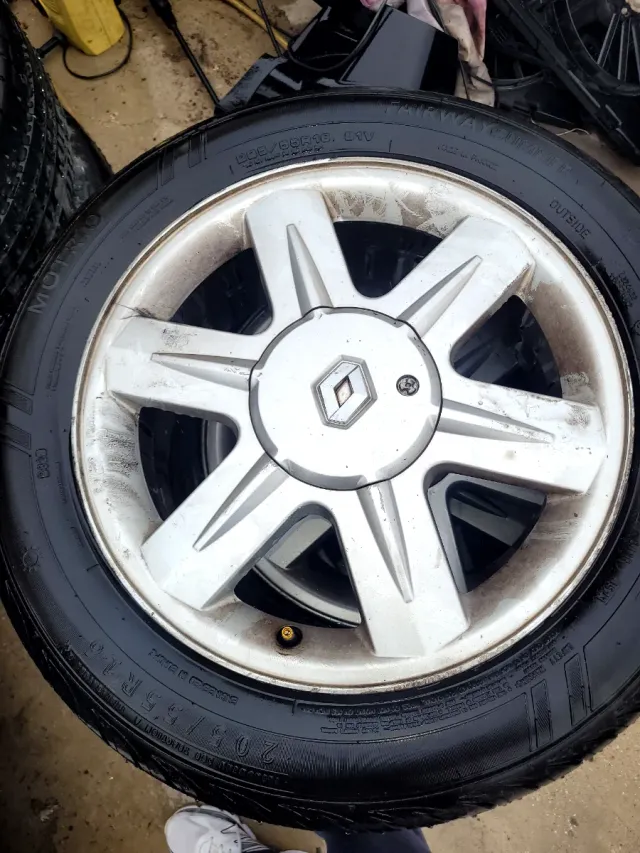 Juego de llantas de aleación para Renault Laguna. - Tamaño: 16 pulgadas. - Diseño de 7 radios. - Incluye tapacubos central con logo de Renault.