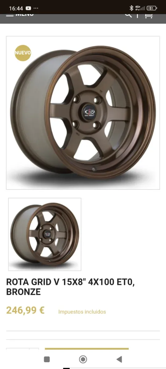 Juego de llantas Rota Grid en color bronce. - Medida: 15x8 pulgadas. - ET0. - Anclaje 4x100 - Con neumáticos.