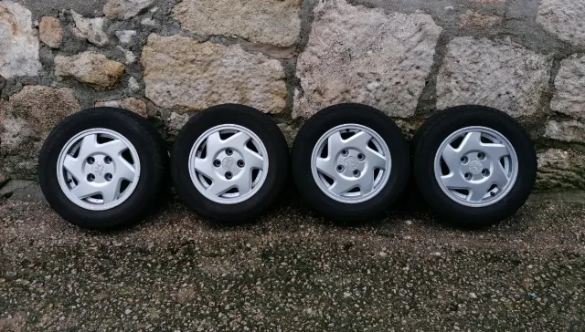 Tienen neumáticos montados en medida 165/70/13, viejos, pero todavía con bastante profundidad. Se han usado hasta ahora; 2 con más dibujo, 2 más gastados.